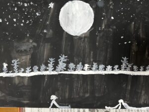 るなちゃんの月夜絵の具で描いてて、夜の雰囲気が出てますね。月がまんまるなのも、いいね。 こたくんの自主勉!沢山の生き物描けましたね。